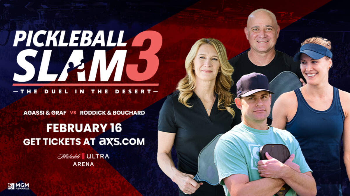 With a staggering $1 million purse once again on the line, tennis legends and defending champions, Andre Agassi and Steffi Graf, return to defend! Andre Agassi and Steffi Graf defend their Pickleball Slam title against tennis Hall of Famer Andy Roddick and Wimbledon finalist Eugenie Bouchard.